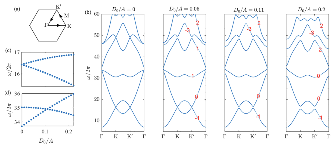 图2. (a). 布里渊区。(b). 不同界面DM强度时的能谱。数字表示左手性支的对应能带的陈数。(c). 第一条与第二条能带的带隙变化。(d). 第三条和第四条能带带隙的变化。