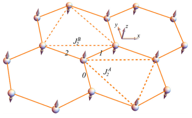 图8. 六角共线反铁磁体系,A和B两子格的子格内次近邻海森堡相互作用不对称,J2A≠J2B。