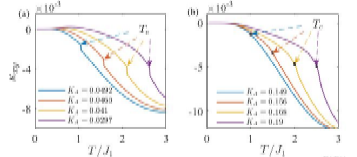 在有限温度下,利用有限温度场论的方法来处理自旋波之间的相互作用,提取对自旋波的温度依赖的自能修正。有限温度下的相图如图10 (a)所示。在零温下拓扑非平庸区间的拓扑相并不会被温度破坏。有趣的是,零温下拓扑平庸的区间当温度升高超过某一临界温度之上时,也将展现出陈数为1的拓扑相。在相图的左边区域,随着温度升高,能带在Γ点的带隙在临界温度关闭,继续升高温度打开带隙,实现拓扑转变,如图10 (b)所示。相图左边的拓扑转变起源于有限温度带来的弱亚铁磁相。因为两支能带占据数不同,由此导致A和B两子格的磁化出现差别,带来自旋波的拓扑转变。在相图右边区域,能带在K点带隙关闭重新打开,如图10 (c)所示。