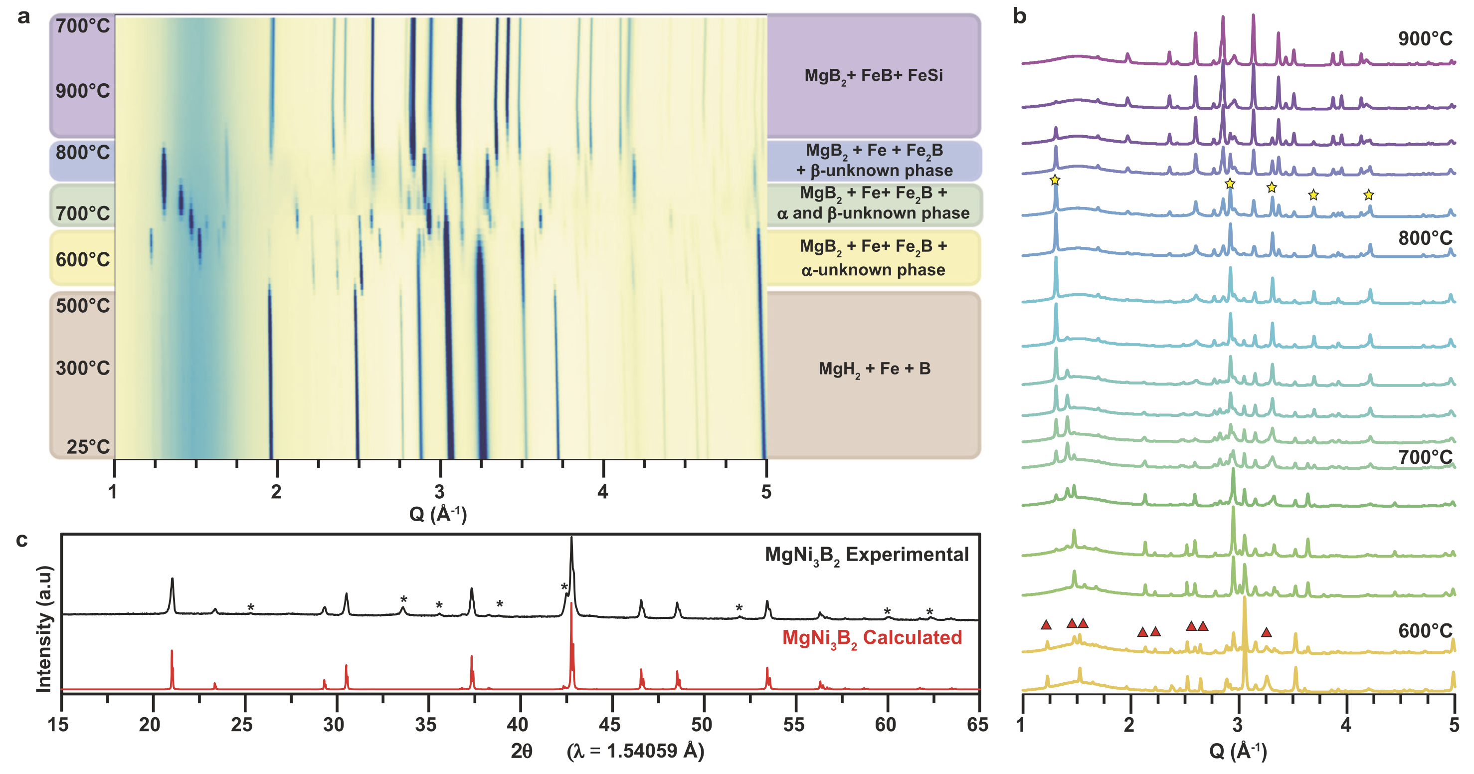 图4 ATB4实验探索以及合成的MgFeB新材料的原位XRD表征。