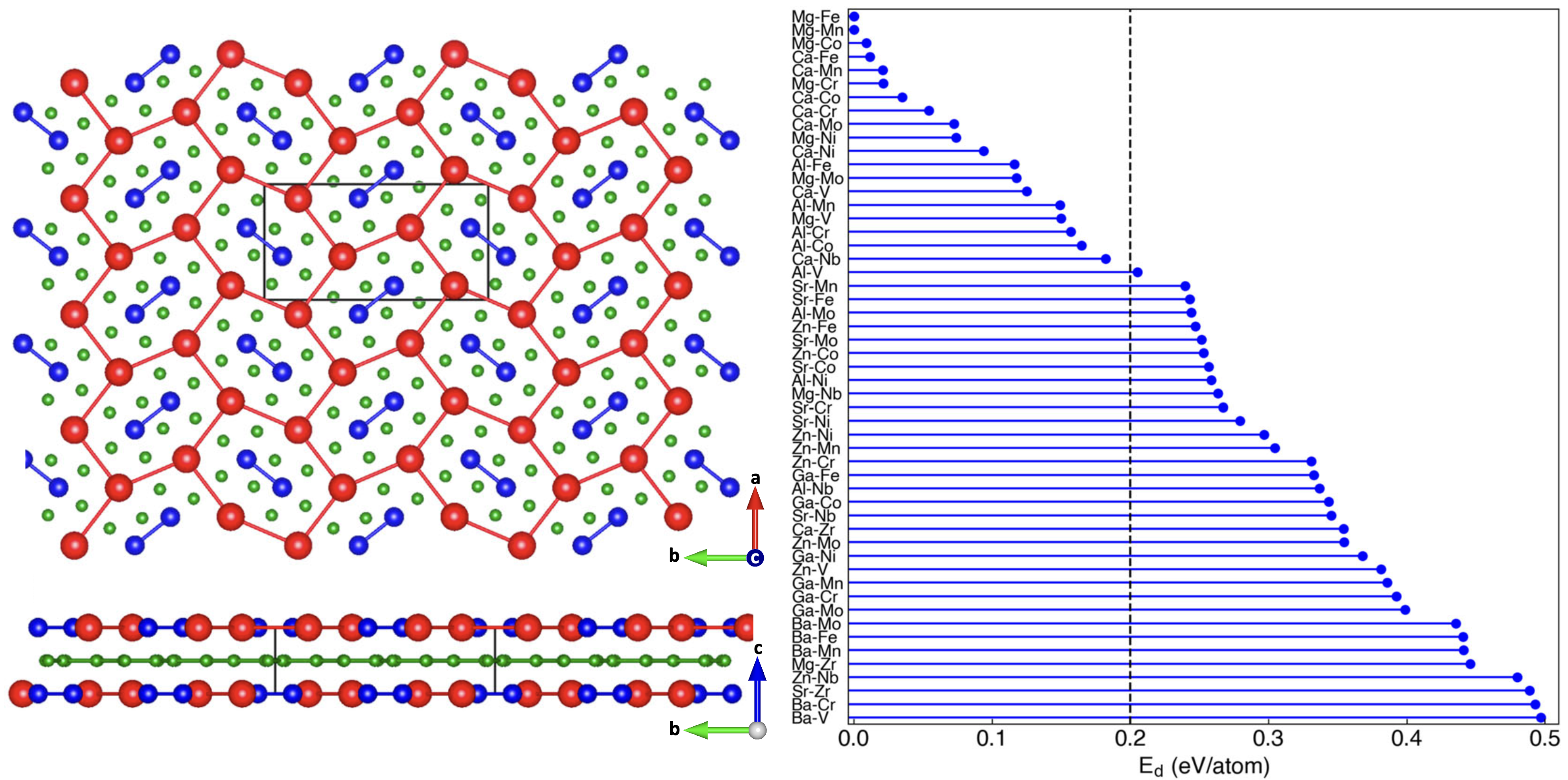 图1 左图:ATB4材料的晶体结构,A(红色)为镁、钙或铝,T(蓝色)为钒、铬、锰、铁、镍或钴, B(绿色)为硼。右图:高通量计算材料的结构稳定性。