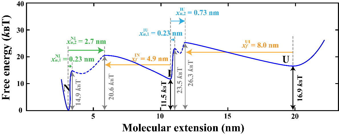 此外,研究团队得到了FNIII10在自然状态态、中间态和去折叠态之间所有与力相关的转换速率,但是发现去折叠速率都与贝尔模型有着明显的偏差。我们由此构建了FNIII10定量的自由能景观,其中包含多个明确位置和自由能差的能垒和势阱。该自由能景观呈现出分层对称的模式。