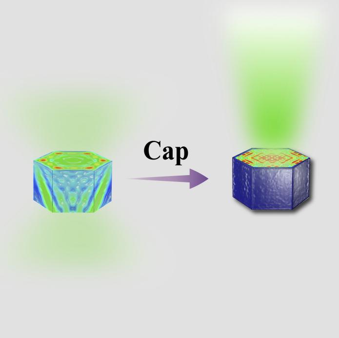 此项工作中,李艾华团队以竖直向上的β-NaYF4:Yb3+,Er3+六棱微柱为模板,获得了三种易制备的UCL增强结构,其中自构型微腔易于制作,方便扩展。银帽中的发光增强随微柱直径的剧烈起伏说明制备的自构型微腔具有良好的品质因子,对微晶的UCL最大实现了43倍增强。模拟计算获得的各种结构中激发场分布图与实验捕捉到的发光图一致,暗示激发增强是UCL增强的主要原因,不同于发射激光时普遍报道的辐射增强。此外,远场分析表明银帽中的微柱实现了定向发射。
