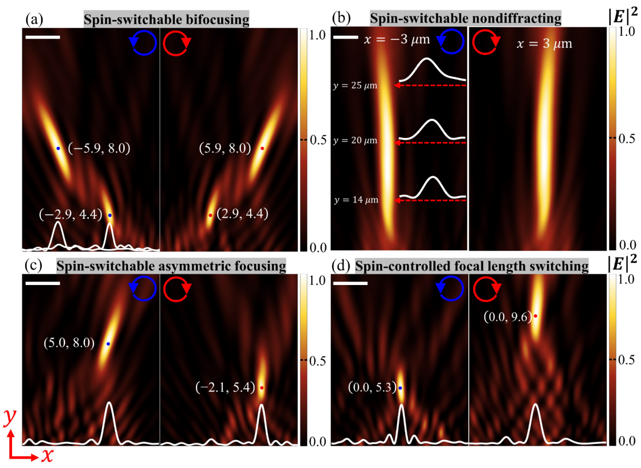 此外,研究团队还首次提出了结合优化算法的表面等离激元超表面通用设计流程,使自旋态调控复杂波前成为可能。通过这套流程团队展现了双聚焦、非衍射光束、焦距变换等复杂波前的自旋态操控。得益于对激发相位-振幅能独立调控和基于算法的全局优化,焦点切换消光比高达52,为同类器件中最高。