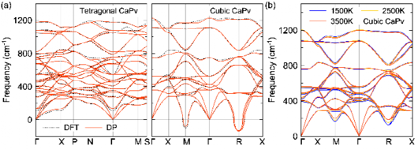 图1 机器学习势计算(a) 70 GPa、0 K条件下四方相和立方相毛钙硅石的声子谱,(b)立方相在1500 K、2500 K和3500 K下的高温声子谱。