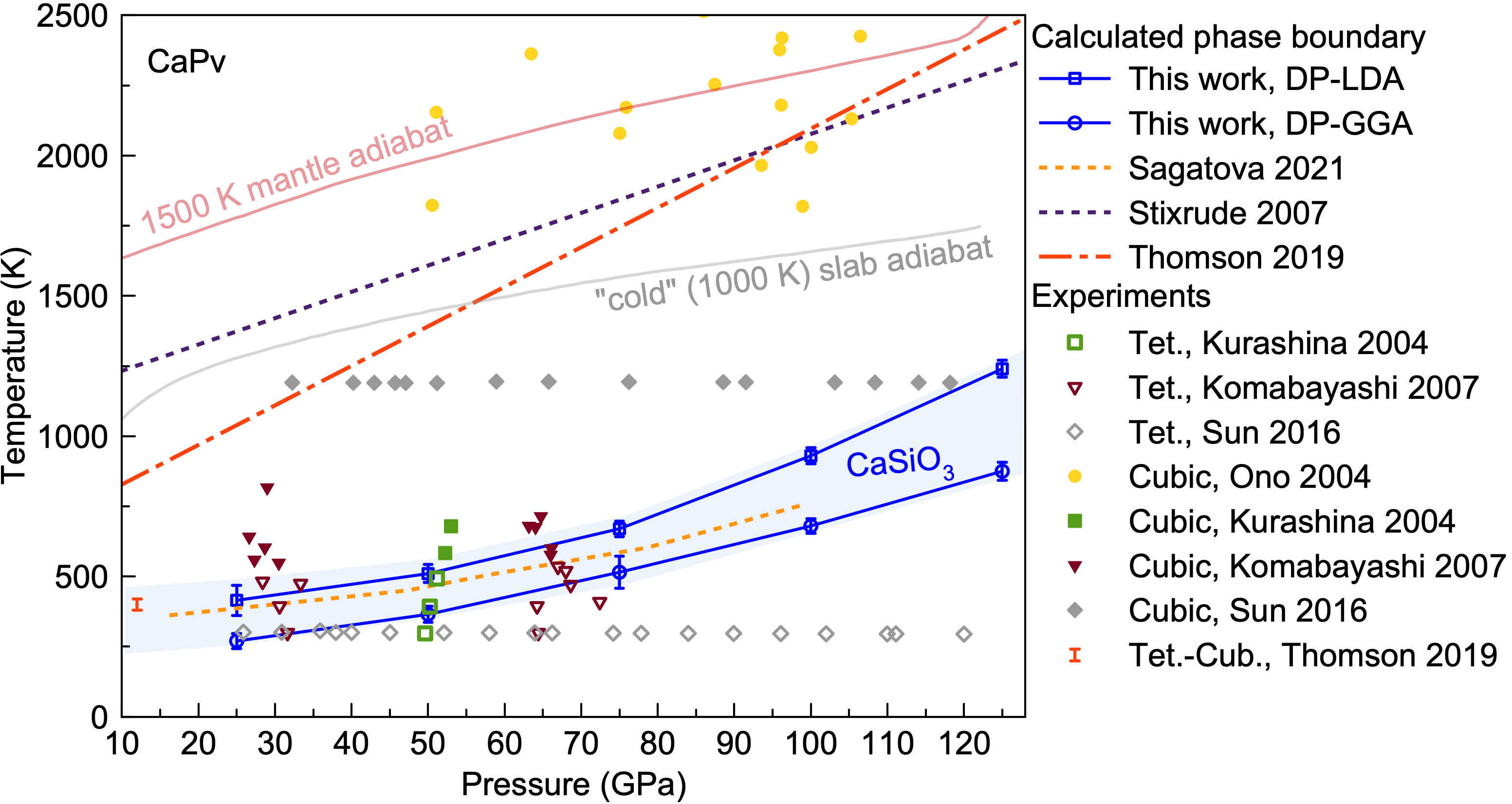 地幔矿物的相变是影响地球深部结构及其动力学演化的重要因素。毛钙硅石(Davemaoite)是地幔中储量丰富且具有重要地球化学意义的矿物,因著名地球物理学家毛河光院士而得名,其含量约占整个下地幔体积的5-10%。随着温度和压力的变化,毛钙硅石会发生从四方晶相向立方晶相的转变。然而,毛钙硅石的四方相与立方相之间的相边界一直存在争议。由于毛钙硅石在常温常压环境下无法稳定存在,压力卸载后会退变为无定形结构,这使得对其进行实验研究非常困难。此前的研究(Thomson et al., 2019, Nature)通过实验测量结合理论计算,提出毛钙硅石的四方-立方相边界接近冷俯冲板块绝热线,并用此解释下地幔中部地震波散射体的起源。然而,毛钙硅石在高温下的强烈非简谐效应限制了常规第一性原理计算方法的使用,极大影响了相界理论计算的准确性。