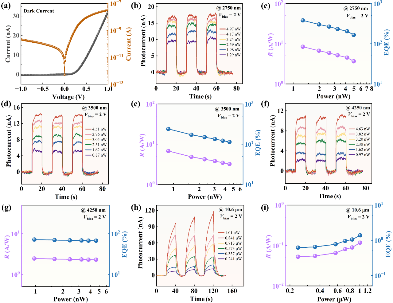 图3. PtSe2/MoTe2光电探测器在中波红外至长波红外光照射下的光电响应特性。