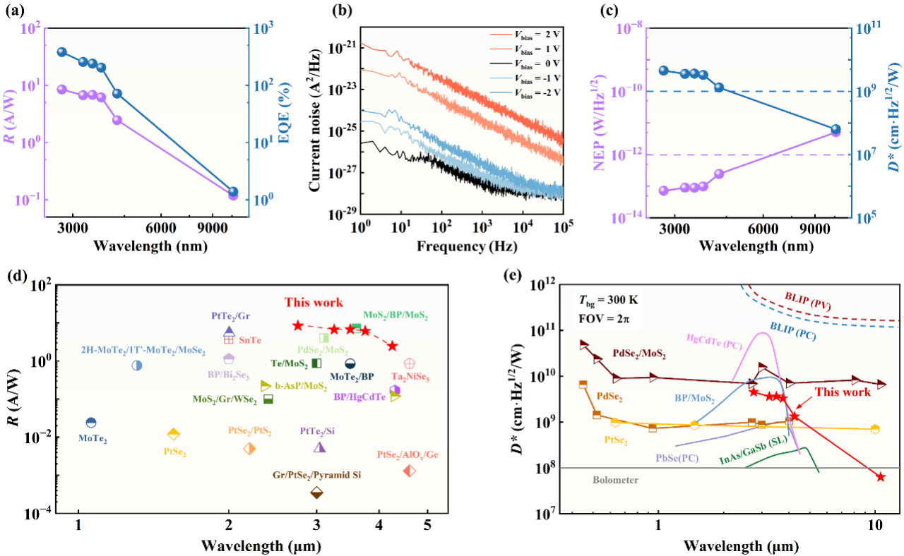 图4. PtSe2/MoTe2光电探测器的高灵敏宽带响应特性。