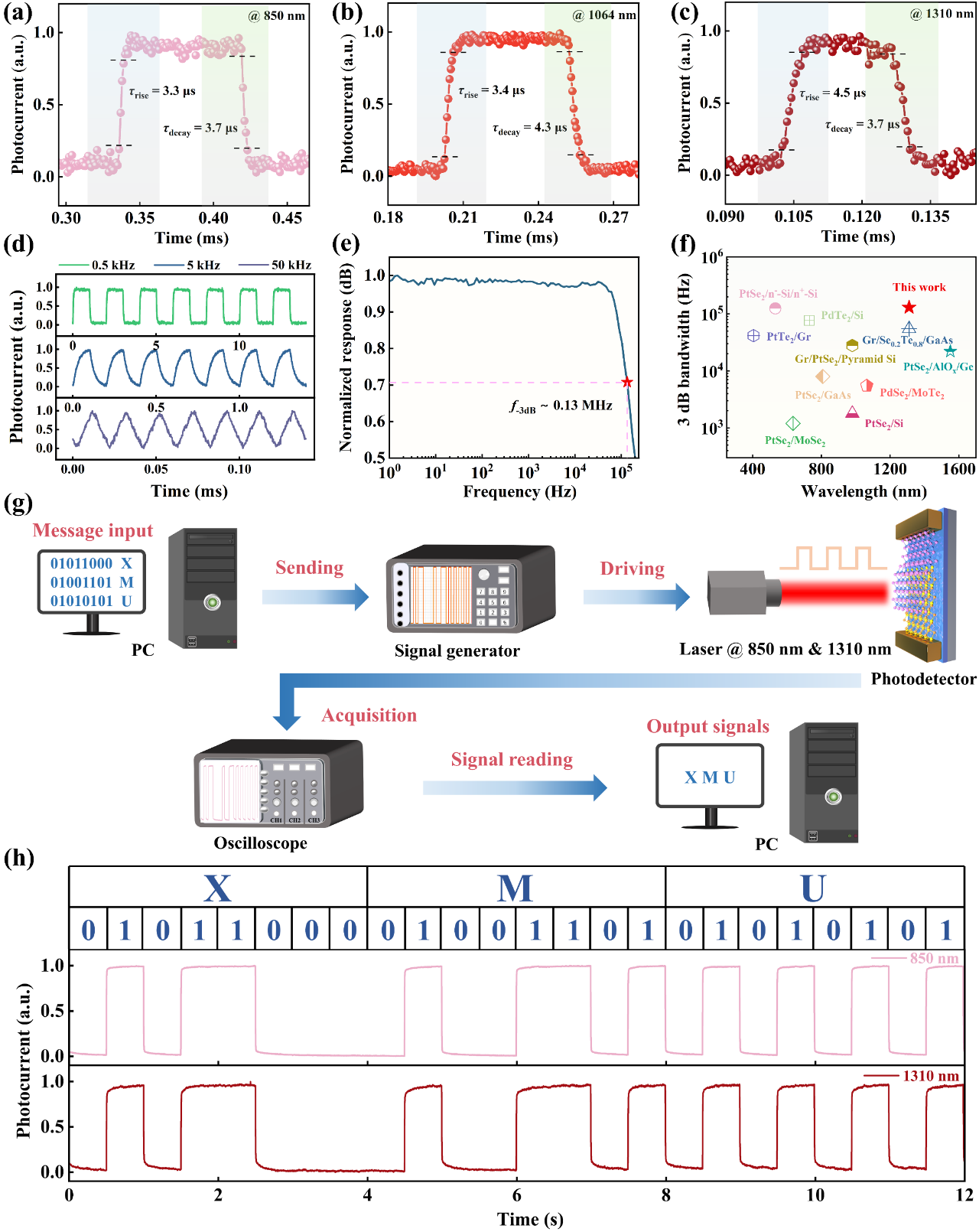 图5. PtSe2/MoTe2光电探测器的光响应速度及红外通信应用展示。