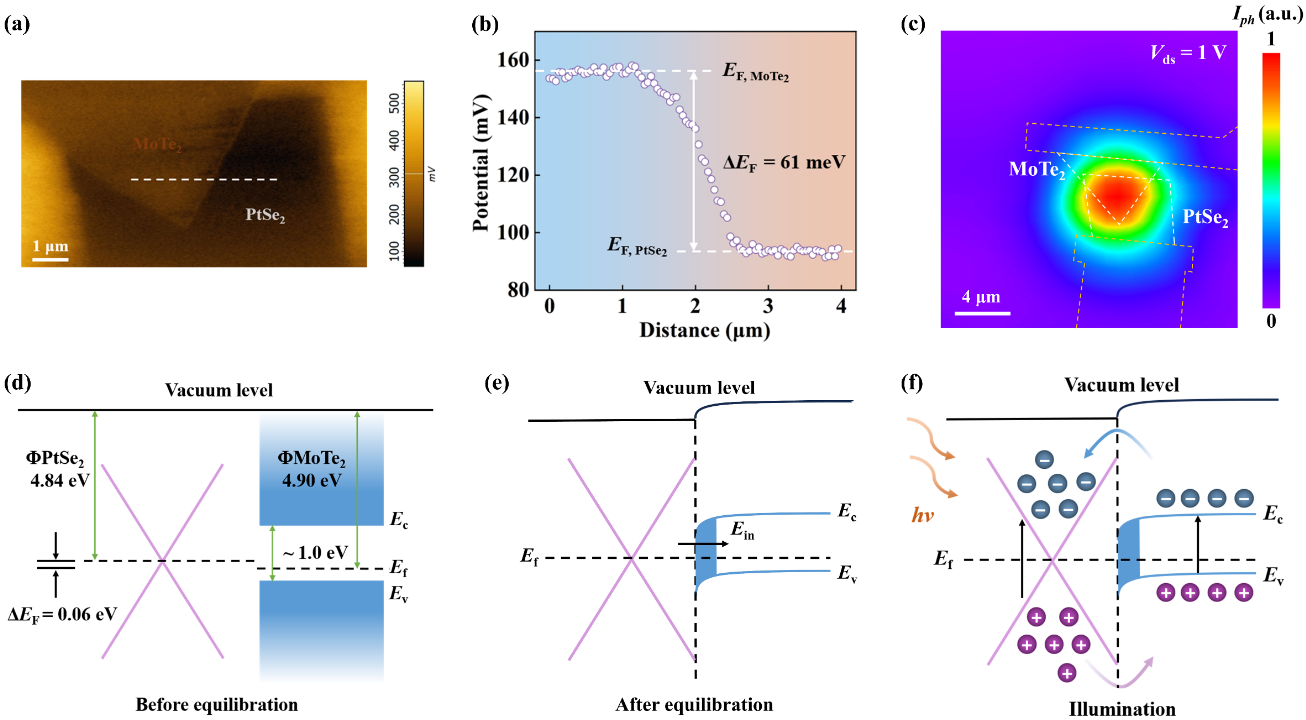 图1. PtSe2/MoTe2范德华异质结光电探测器的基本表征。