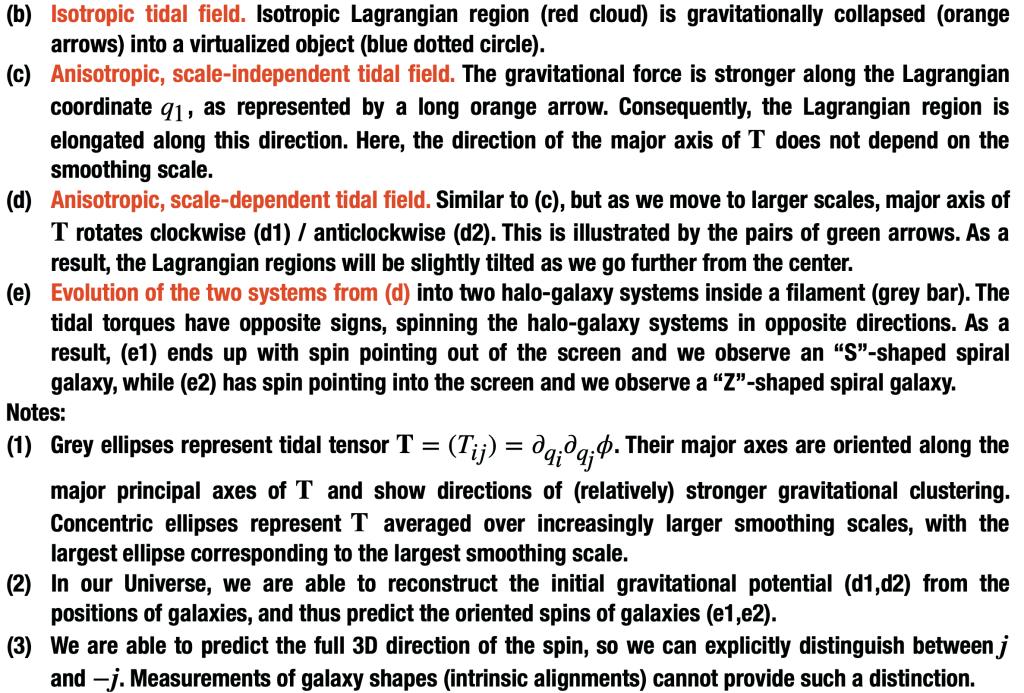 潮汐扭动(tidal twist)—— 星系分布可重构宇宙原初密度场。我们提出利用密度(潮汐)场信息重构原初角动量信息(spin mode reconstruction),并验证了其与星系/暗物质晕的可观测角动量的相关性。潮汐场,即密度场的逆Laplace算子的Hessian矩阵。图(b-e)中展示了二维空间的宇宙中潮汐与星系角动量的联系,其中我们用椭圆的长轴和短轴表示潮汐张量的两个本征轴,椭圆的大小对应于相应(平滑)尺度的潮汐。(b)中各向同性且不依赖于尺度的潮汐场导致球(圆)塌缩,不产生角动量;(c)中各向不同性、但尺度无关的潮汐导致椭圆塌缩,不产生角动量;(d)中不同尺度潮汐场的本征轴(绿色箭头表示潮汐主轴)随尺度变化,大尺度的潮汐场扭动小尺度的原星系(protogalaxy),产生角动量spin mode,并在(e)中的宇宙纤维结构(cosmic filament)中形成两个角动量相反的星系。(d1,e1)和(d2,e2)互为镜面反演;这种奇宇称(parity-even)的可观测量可被原初偶宇称(parity-even)的密度场(标量)及潮汐场(对称张量)预测,因此这个可观测的角动量也是早期宇宙的探针。早期宇宙的宇称破缺可能会通过这种spin mode携带到今天星系的角动量场。Yu, Hao-Ran et al. 的Conclusion and discussion中及相关参考文献给出了可能的对称性破缺机制。