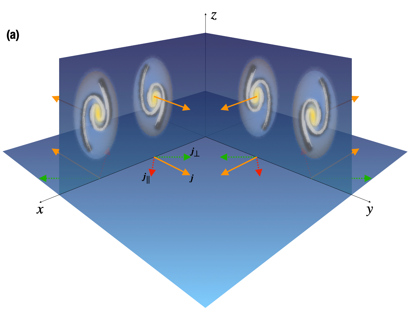 如何观测星系角动量 —— 图(a):通过观测盘星系(薄盘近似)在天空的投影椭圆可以推测出星系旋转的角动量方向的四种可能性。为消除这四种角动量方向的简并,我们还需要观测旋涡星系的旋涡“缠绕”方向,分别为“S”型或“Z”型,以及星系盘的颜色梯度,如图(a)所示。绝大多数星系向旋臂“凸”的方向旋转,且在远离观测者的方向呈现更多的尘埃消光(颜色偏红)。另外,谱线的Doppler效应也可以测量星系的旋转方向。图(a)橙色箭头表示了星系的角动量方向,红色/绿色箭头表示沿视线平行/垂直方向的角动量方向。