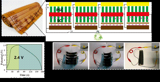 近来,厦门大学物理科学与技术学院郭文熹副教授借鉴植物叶片的光合作用,巧妙利用纳米管的对称性,在二氧化钛管阵列两端高度集成柔性钙钛矿太阳能电池与柔性全固态超级电容器。在该器件中,钙钛矿电池采用背照射结构,通过静电纺丝技术,在电极顶部制备金属纳米丝来取代传统的金属薄膜,大大地增加了其透光性能和机械柔性。在太阳光的照射下,光生电子迅速通过纳米管阵列到达另外一端(超级电容器的负极),对超级电容器进行充电,直接快速地实现光能-电能-化学能的转化,取得了5.1%的总转化效率。该器件具有超薄和超柔性的特点,轻质耐弯,可进行反复的弯折甚至卷曲。同时集成器件可做成长条状,像竹简一样进行串联,不仅可以实现电压的可调,还可以在闲暇时卷起来节省使用空间。该集成器件有望为便携式电子器件以及小型传感器进行户外供电。