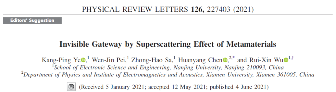 本工作以“Invisible Gateway by Superscattering Effect of Metamaterials”为题发表在近期的Physical Review Letters上,并入选编辑推荐。该论文也被Nature以“Not just sorcery: scientists build an invisible portal”为题专题评述(https://www.nature.com/articles/d41586-021-01561-3)。厦门大学的陈焕阳教授和南京大学的伍瑞新教授为论文共同通讯作者。