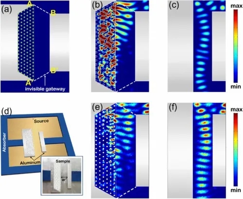 图2 电磁隐形门 (a)示意图;(b)仿真结果;(c)隐形门被金属波导替代;(c)实验设施;(e)-(f)实验结果。