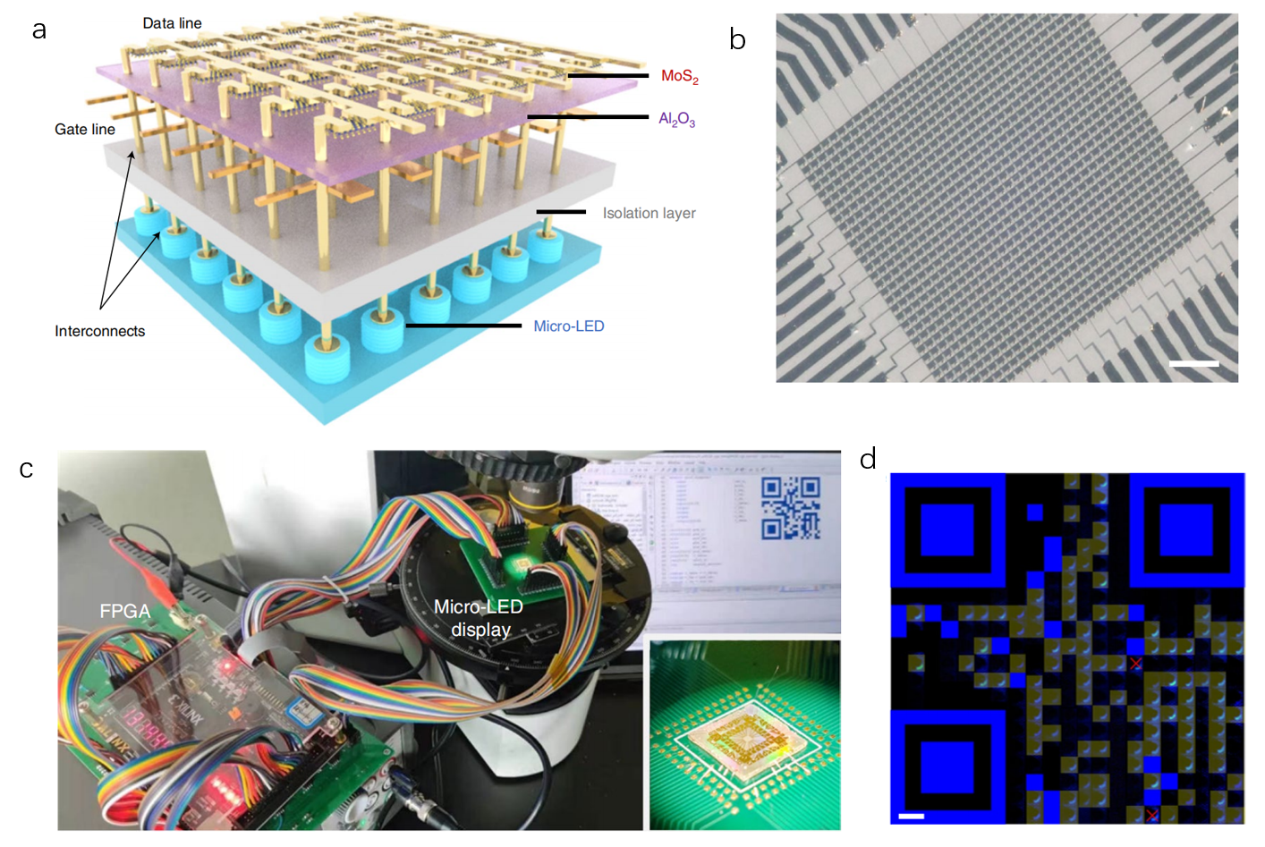 图1.(a)MoS2 TFTs 与Micro-LEDs单片集成电路示意图及(b)光学显微镜图;