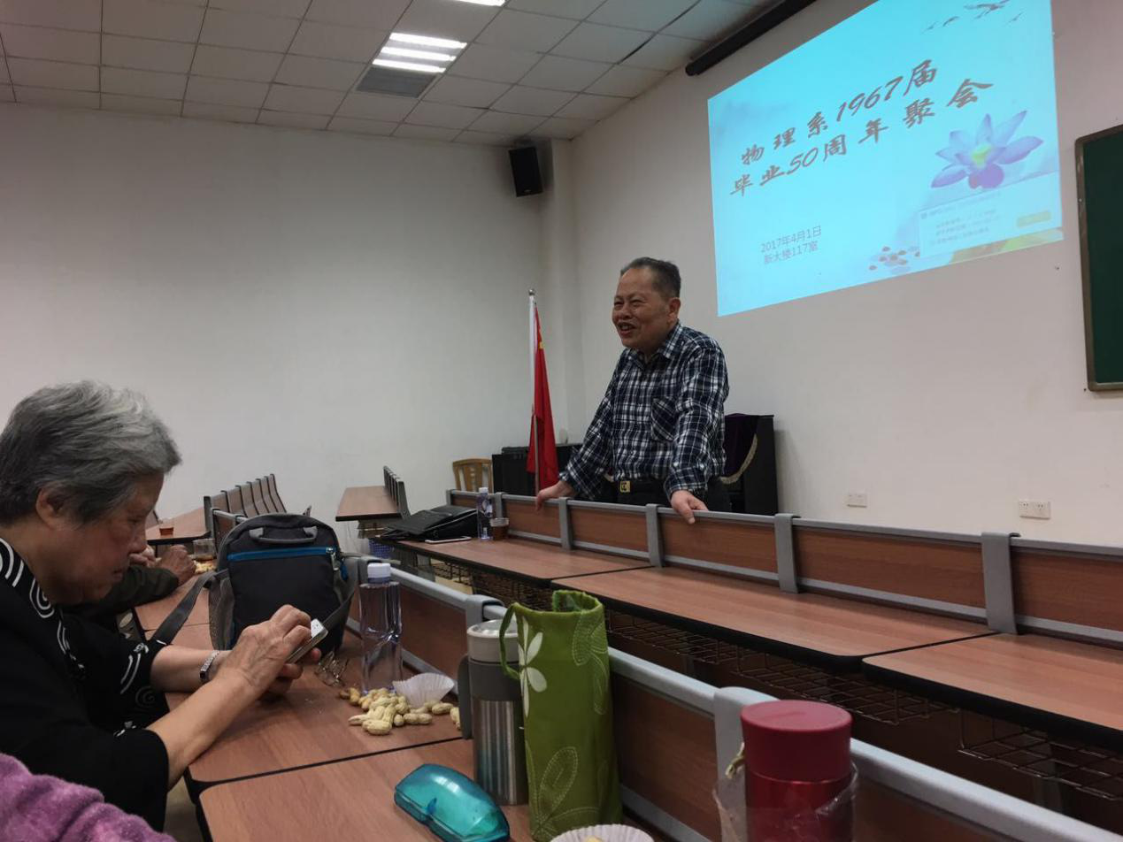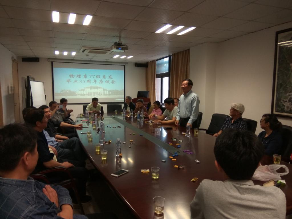4月15日下午,物理系77级系友在物理机电航空大楼307会议室举办毕业35周年同学聚会。首先,77级班长对百忙之中抽空参加聚会的系友们表示诚挚的感谢。之后,现物理系副系主任吴顺情向在座的系友介绍了学院及物理系近几年的变化,虽然原来的物理机电与工程学院分成了物理科学与技术学院和航空航天学院,物理系的专业与35年前相比也发生了很大的变化,但是无论物理系怎样变,它永远是物理系系友的“根”。