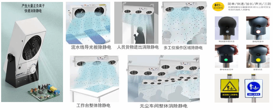 4. 静电安全防护要求较高的场所环境,按需选择合适的专业防静电设备如防静电刷、离子风机、静电消除棒等耗散中和静电。