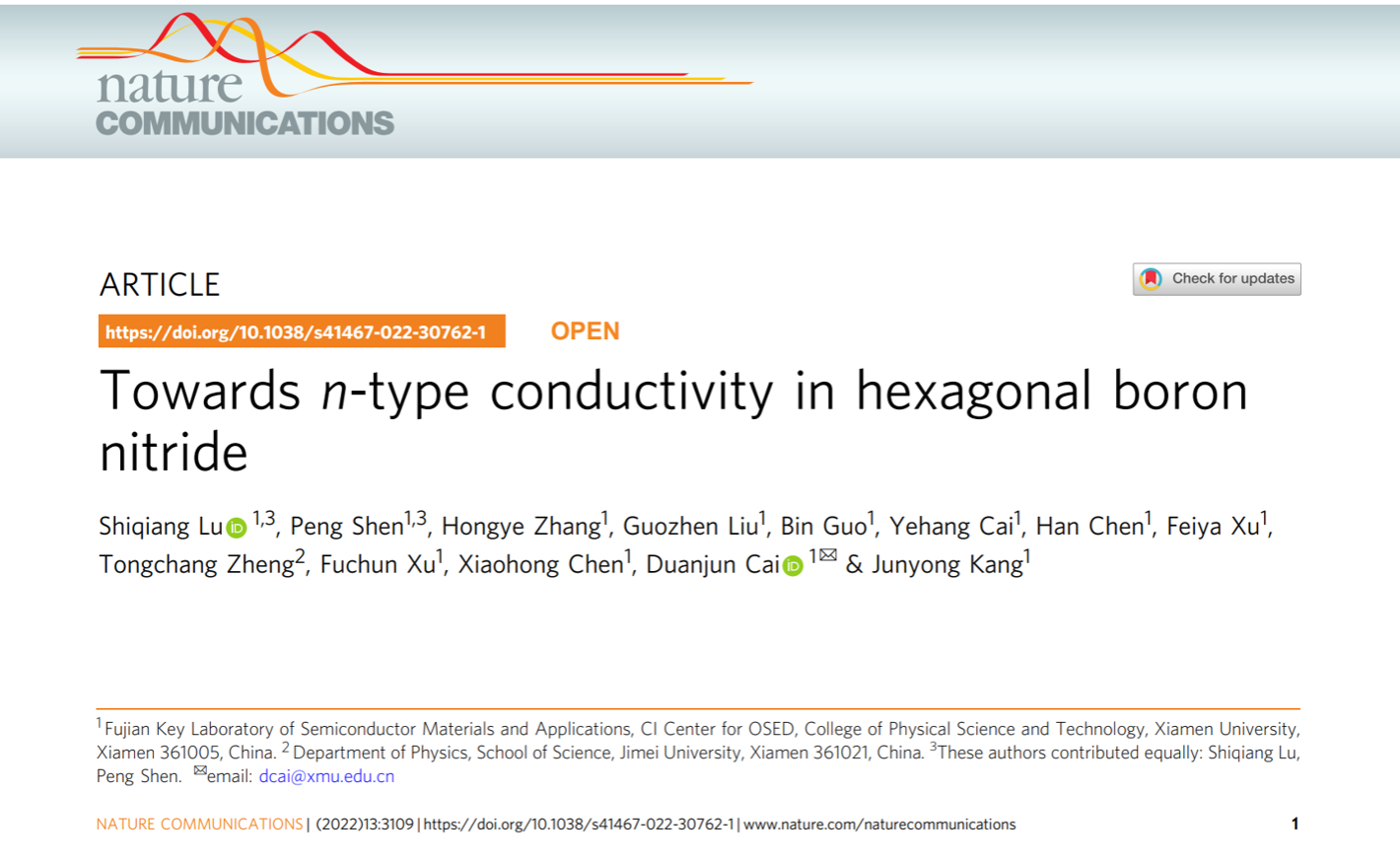 2022年6月3日,Nature Communications期刊刊出了我院蔡端俊教授课题组、康俊勇教授团队发表的题为“Towardsn-Type Conductivity in Hexagonal Boron Nitride”的最新研究成果论文。该论文建立了一套调控超宽禁带二维半导体导电类型的理论和掺杂技术,提出牺牲性杂质的轨道耦合技术,以调控二维六方氮化硼(h-BN)中的施主能级浅能化,在实验上第一次成功获得二维半导体h-BN的n型导电。该研究为解决宽禁带半导体中n、p型导电严...