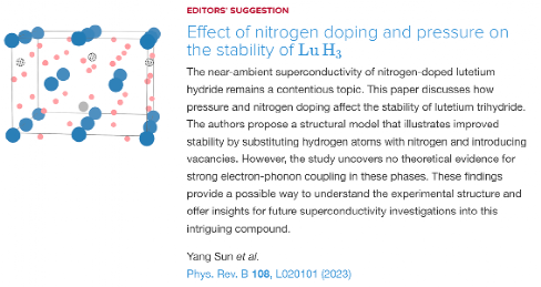 寻找室温超导体一直是科学界的巨大挑战,其成功能为许多未来应用开辟道路。最近,人们发现了许多在超高压条件下具有高超导转变温度的氢化物,这为实现室温超导提供了可能性。然而,对于实际应用而言,高压条件仍然过于极端。因此,人们提出了一种新思路,即通过利用硼、碳等轻元素掺杂或替代氢元素,以降低所需的高压条件。最近,Dasenbrock-Gammon等人报告了在近乎室温室压环境条件下,在氮掺杂的镥氢化物中观察到超导现象的实...