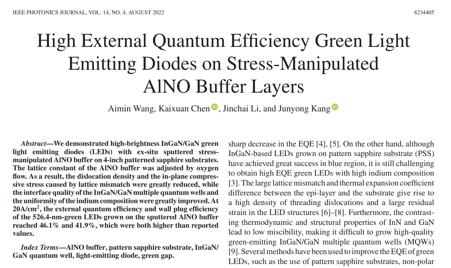 近日,厦门大学物理科学与技术学院与乾照光电协同攻关,在提升绿光LED效率方面取得重大进展。该研究成果以“High External Quantum Efficiency Green Light Emitting Diodes on Stress-Manipulated AlNO Buffer Layers”为题发表于IEEE PHOTONICS JOURNAL 14(4) (2022) 8234405。近年来,半导体发光二极管已经在国民经济的不同领域中得到广泛应用。随着技术的巨大飞跃,蓝光LED的光电转换效率已超70%,同时AlGaInP基红光LED技术...
