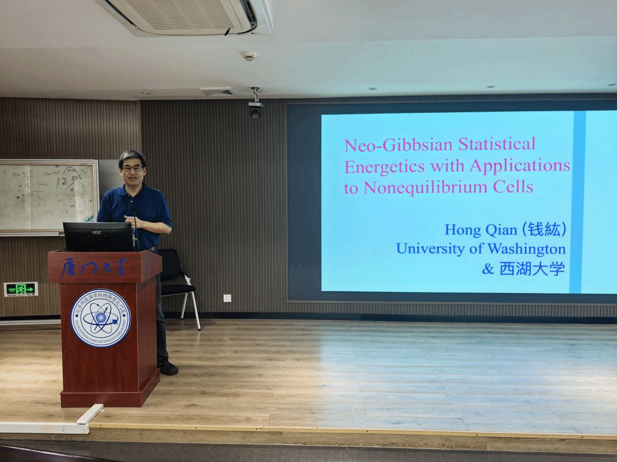 2025年10月24日下午,西湖大学钱紘教授受邀莅临厦门大学,为师生带来题为“Neo-Gibbsian Statistical Energetics with Applications to Nonequilibrium Cells”的第202期萨本栋讲坛。本次讲座由物理科学与技术学院赵鸿教授主持。 赵鸿教授主持 钱紘教授在报告现场讲座伊始,钱紘教授回溯吉布斯百年统计热力学的核心思路,指出这一经典框架在处理实际非平衡体系时仍然可以被重新解释和推广,从而形成他提出的“新吉布斯统计能量论”...