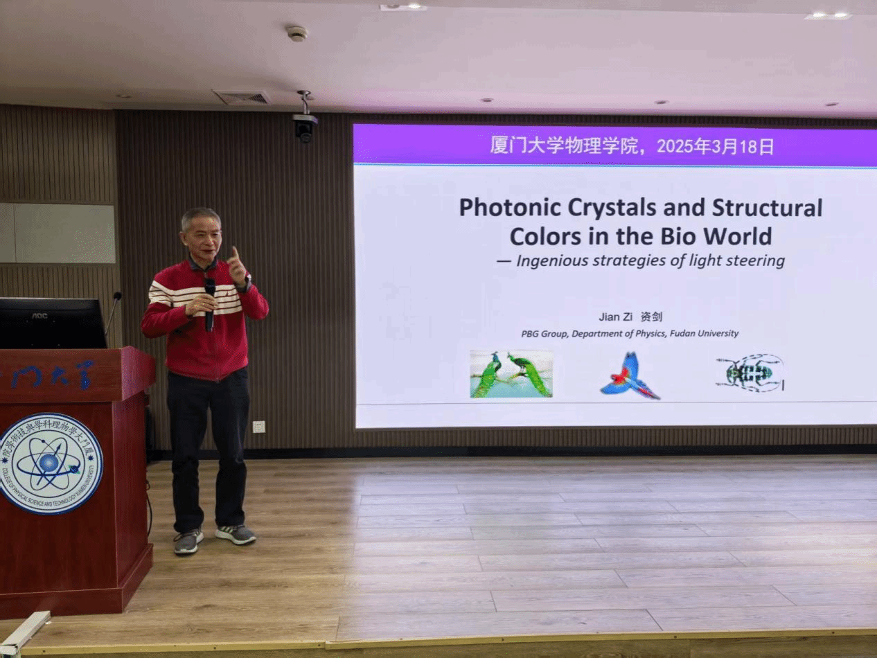 3月18日下午,厦门大学物理科学与技术学院特邀复旦大学物理系资剑教授来校作题为“生物界光子晶体及结构色”的萨本栋讲坛193期。资剑教授是光子晶体与自然光子结构领域的权威专家,其团队在揭示生物结构色机理及仿生应用领域取得突破性进展。本次讲座吸引了学院师生、科研人员及相关领域学者近百人参与,共同探索自然与科技的奇妙交融。本次讲坛由物理科学与技术学院院长陈张海教授主持。陈张海教授主持资剑教授在报告中指出,自然界中的颜色主要分为色素色与结构色两类。...