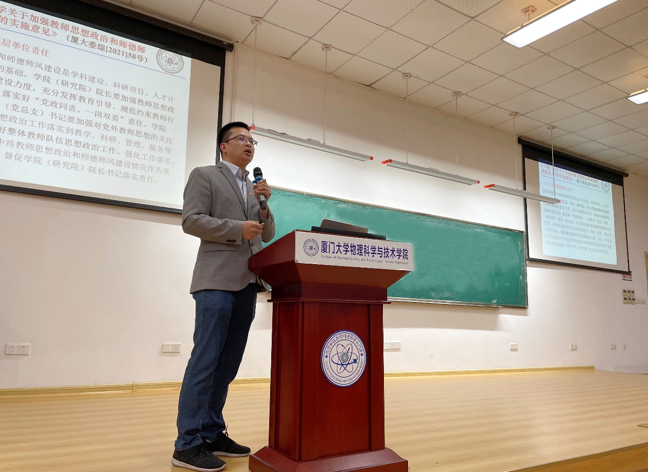 为进一步增强教师思想政治素养和师德师风水平,提高教师法治素养和规则意识,建立风清气正的教育生态,我院于11月19日在物理大楼117教室举办“院长讲准则”、“书记亮警示”师德专题教育活动。活动由学院党委书记李书平教授、副院长陈理想教授担任主讲,全院教职工共同参加本次会议。首先,陈理想副院长开展“院长谈准则”专题讲座,全面解读《新时代高校教师职业行为十项准则》《研究生导师指导行为准则》《教育部关于高校教...