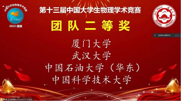 2022年10月3日至10月6日,由新疆大学承办的第十三届中国大学生物理学术竞赛(CUPT)全国赛在线上举办。由物理科学与技术学院学生张元泽、陆晋杨、李明昊、刘晟翔、王祥鹤、陈星宇、龙苗组成的厦门大学代表队在赛场上与兄弟院校的参赛者切磋交流,最后获得总分第14名的优秀成绩。 在三个月的国赛冲刺期中,同学们克服新冠肺炎疫情校园管制、军训备赛时间减少等困难,发挥团结协作精神,争分夺秒地进行理论和实验研究,努力提高...