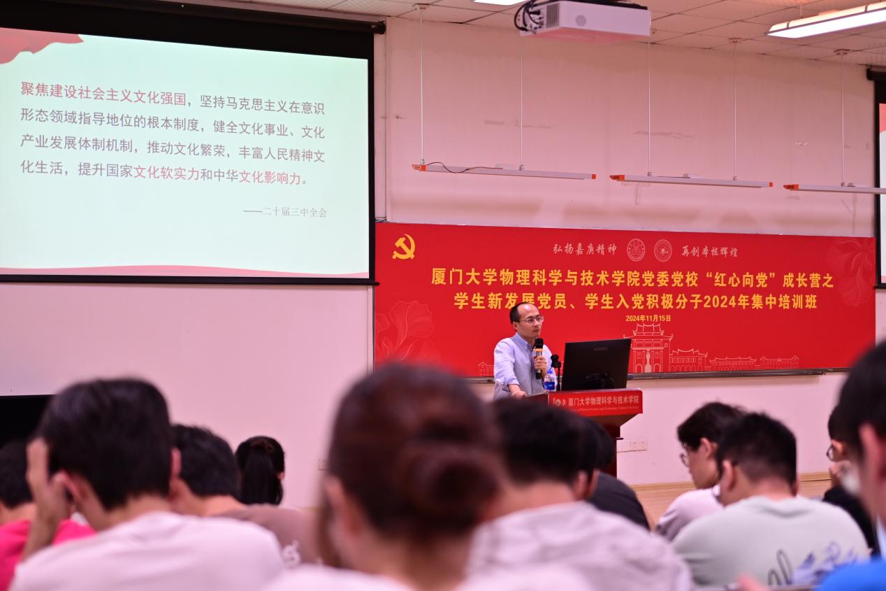 近日,物理科学与技术学院党委党校“红心向党”成长营之学生新发展党员、入党积极分子2024年集中培训班第二场专题报告会在院楼117报告厅举办。厦门大学马克思主义学院副教授晏振宇老师为全体学员带来了《聚焦建设社会主义文化强国——学习贯彻党的二十届三中全会精神》的精彩报告。学院党委副书记沈丽秀、辅导员、党务老师以及全体学生党员和学生入党积极分子共200余人参加报告会。晏振宇围绕如何推进社会主义文化强国建设这一...